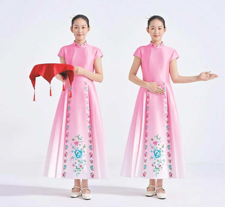 在款式上,连衣裙保持了经典的及踝长度,通过简洁而优雅的线条展现出女性的柔美与端庄,其一体式设计一气呵成,简约而大气。仿旗袍的高立领设计,则增加了服装的结构感和立体感,凸显了东方女性的气质;廓形保留传统马面裙的裙门,工字褶起伏间,步步生莲,展现中华礼仪之美。在颜色上,礼仪服整体颜色以粉色为主,象征着希望、青春和活力。单一色彩深浅渐变的应用让服装整体更显时尚。