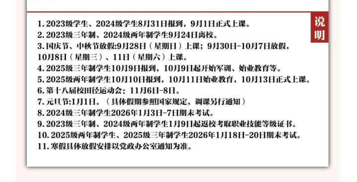 记者查询校历发现,网友晒出的嘉兴南洋职业技术学院、重庆中医药学院均在十一假期后开学。前者的2025级三年制学生10月9日报到,2025级两年制学生10月10日报到;后者的2025级普通本科新生于10月8日报到注册。